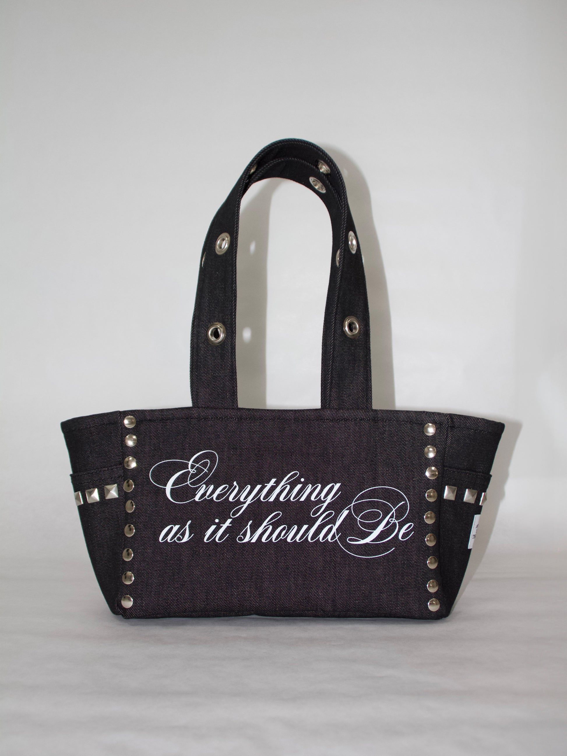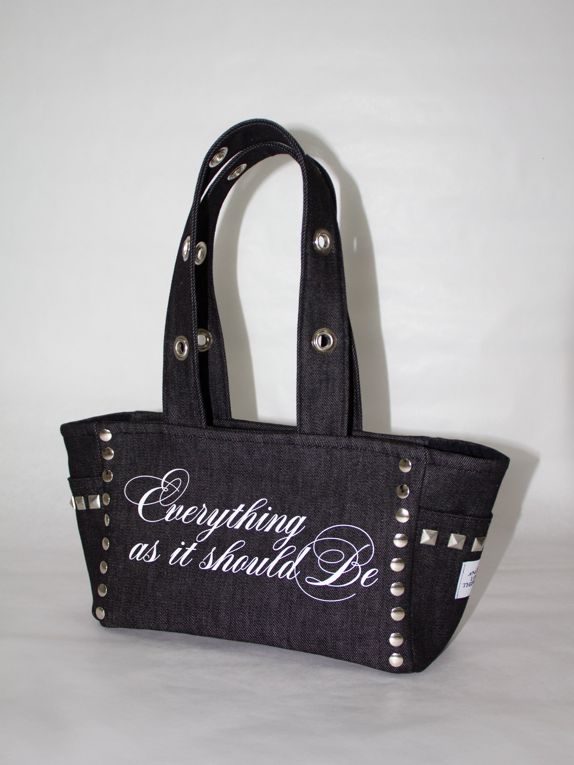 Bolso denim negro con estampación en DTF, fornituras metálicas en plateado, cremallera y dos bolsillos laterales.