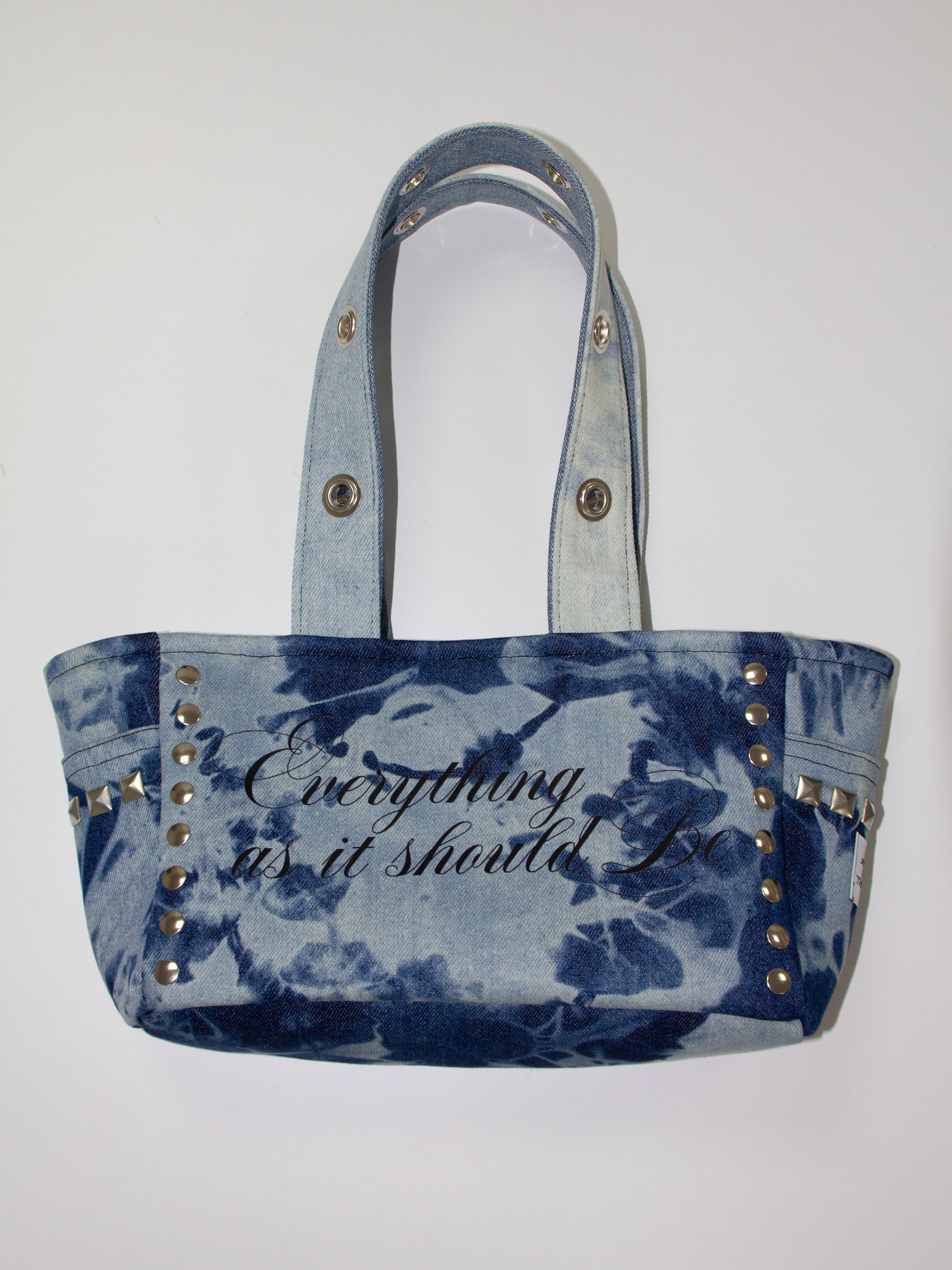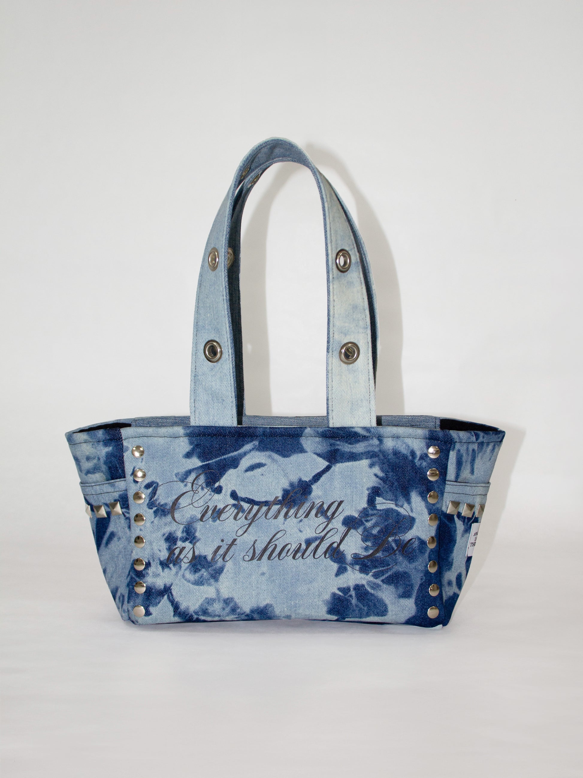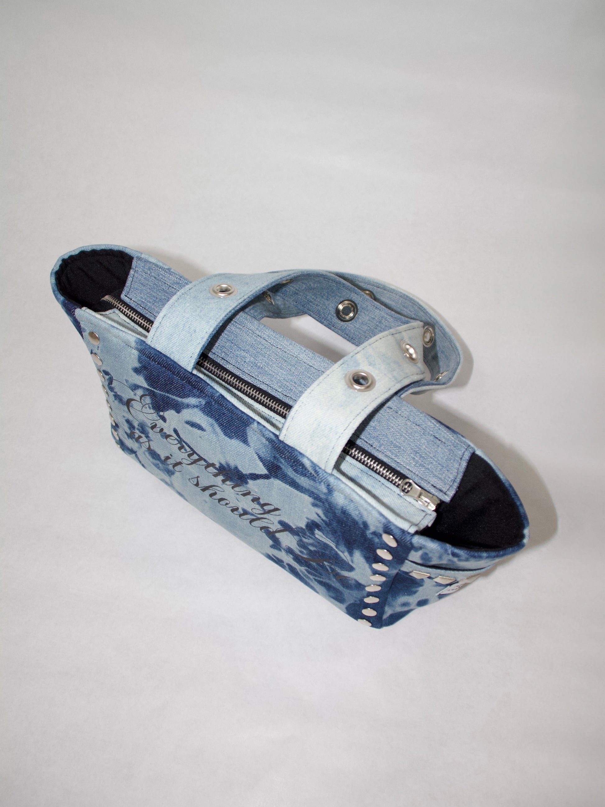 Bolso denim azul con estampación en DTF, fornituras metálicas en plateado, cremallera y dos bolsillos laterales.