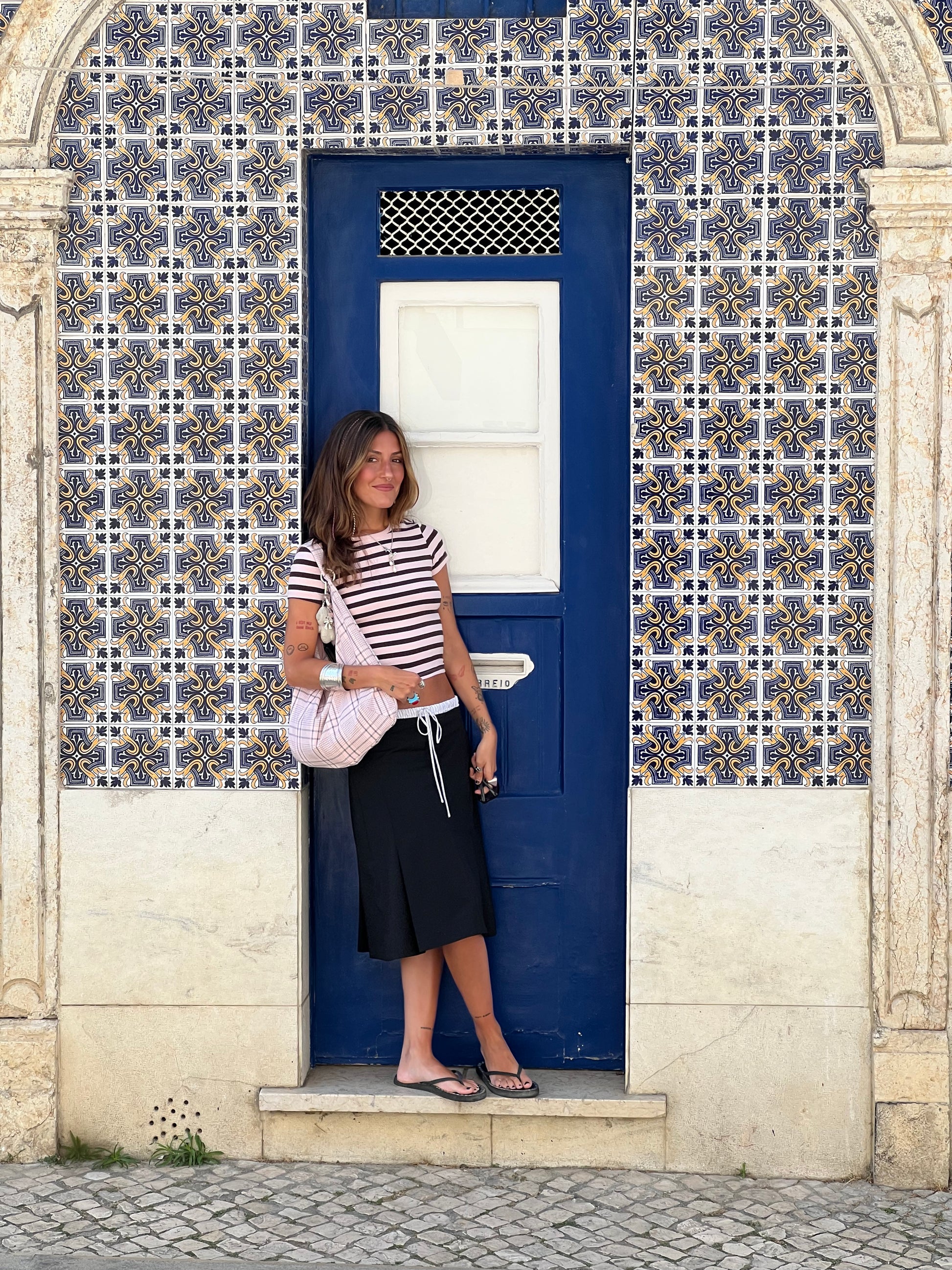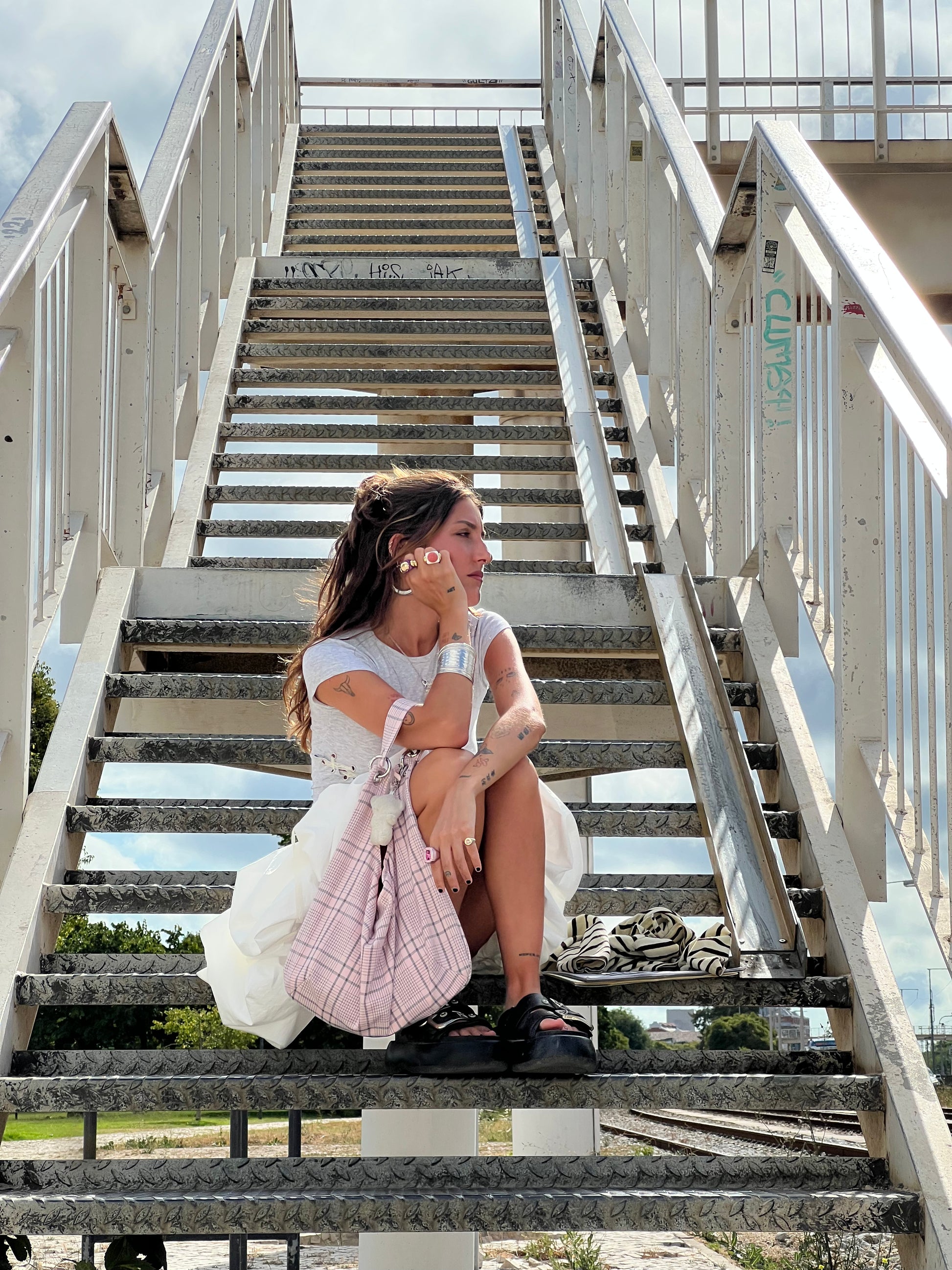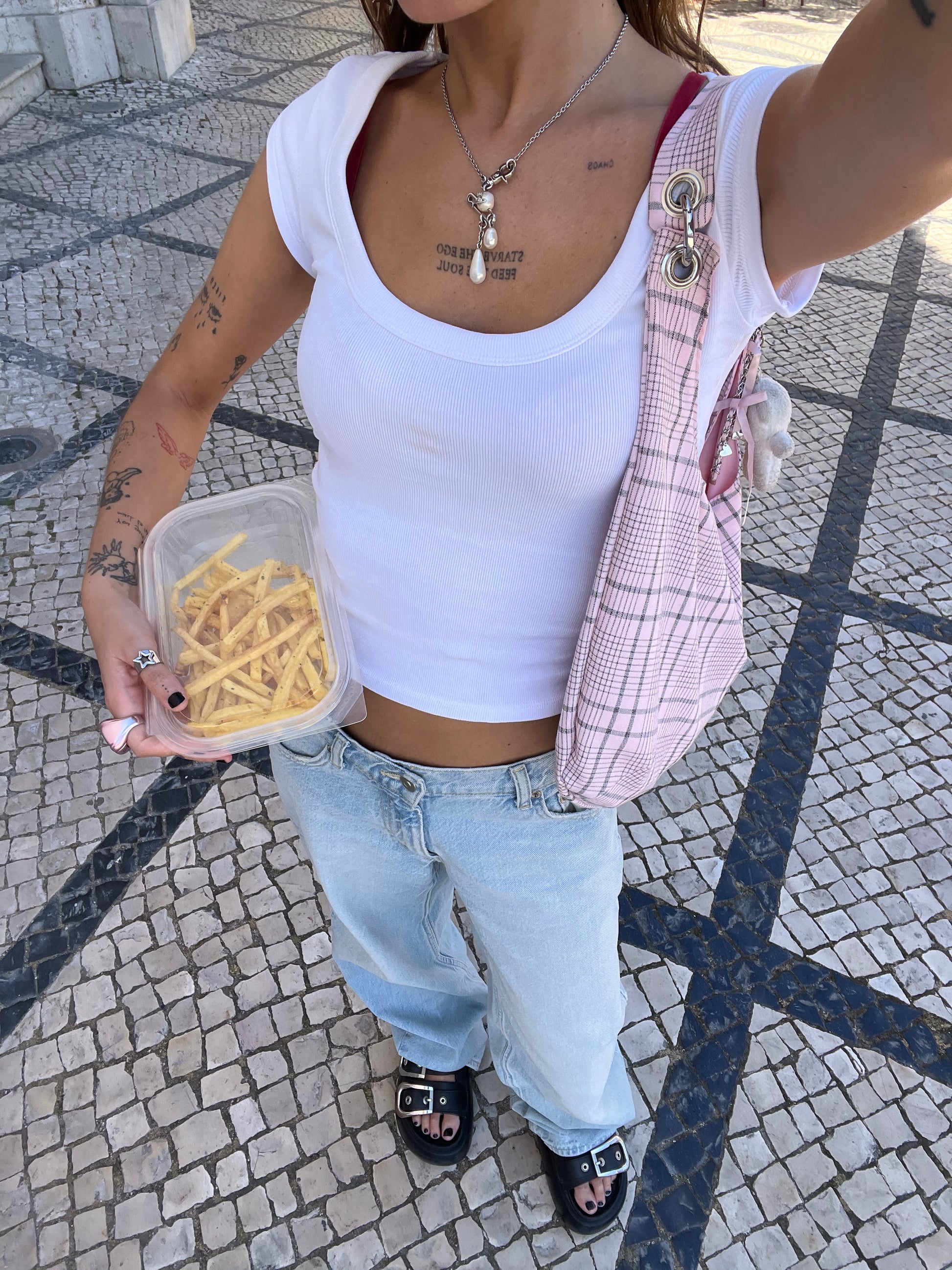 Baby pink checkered print bag.