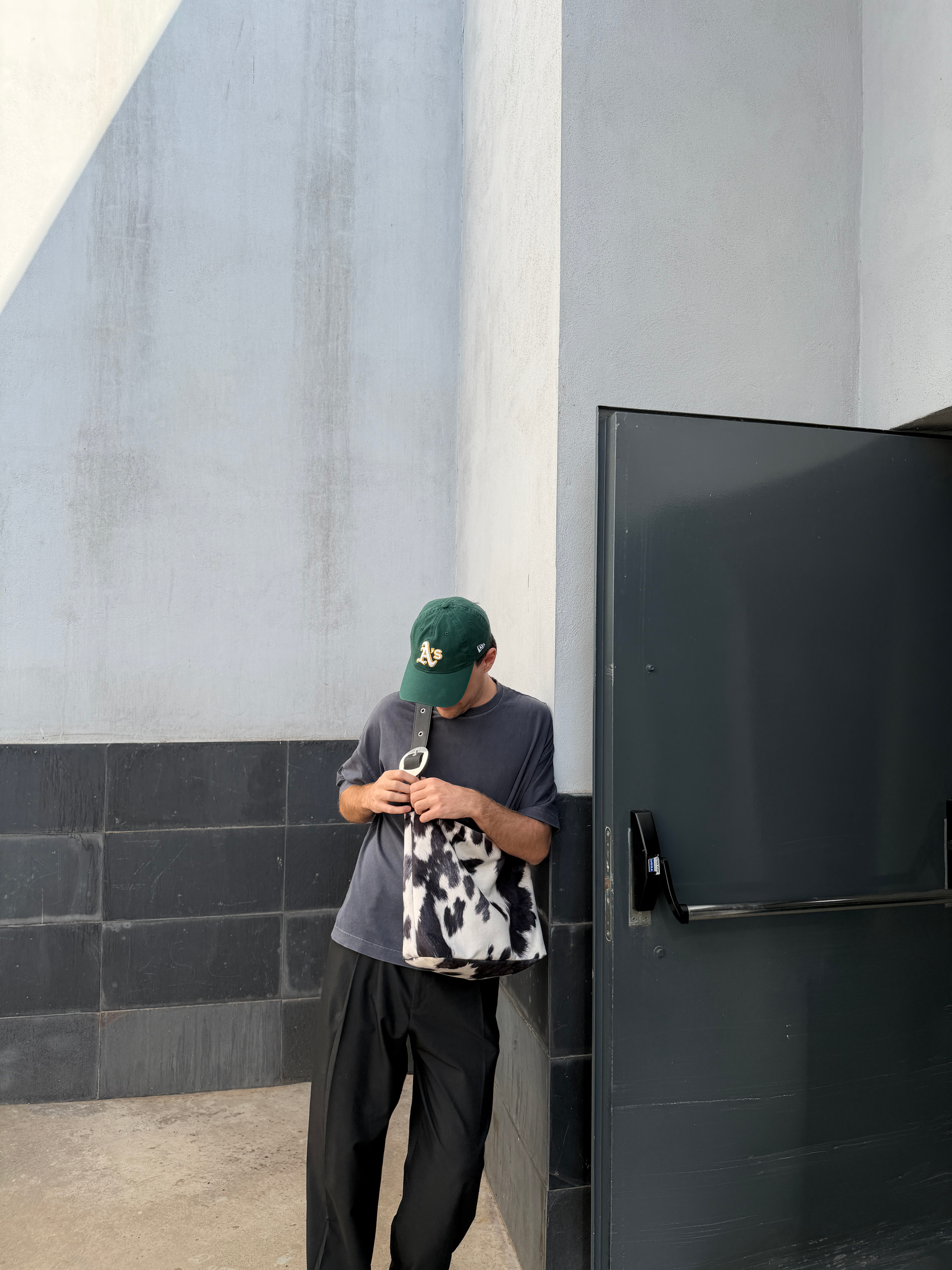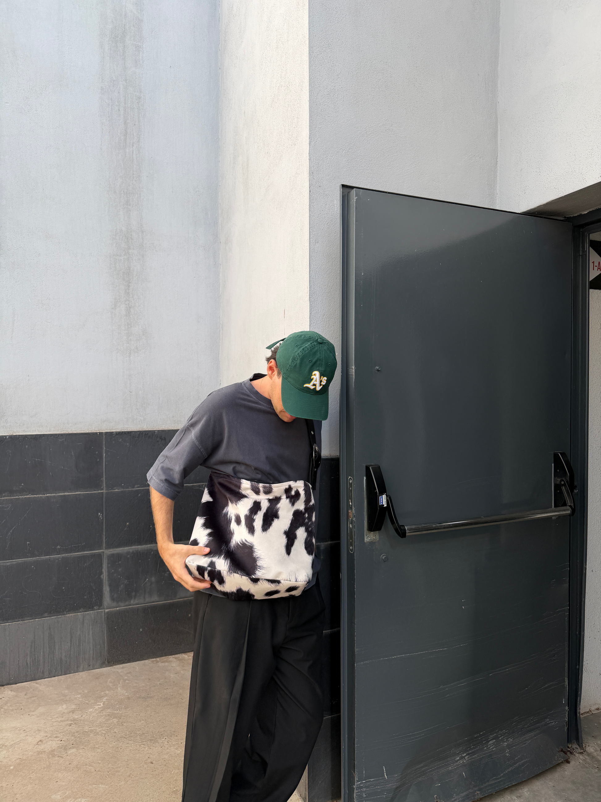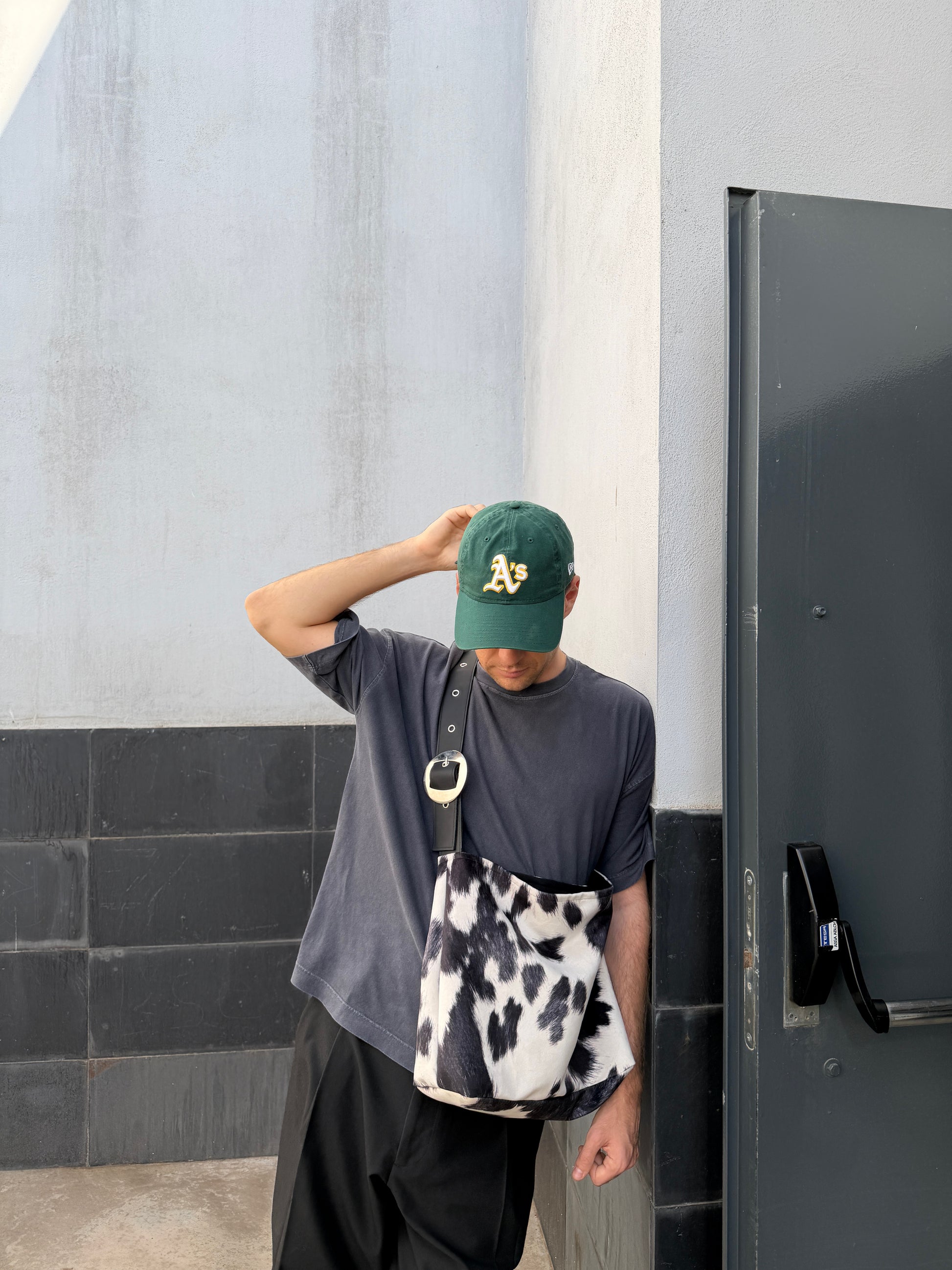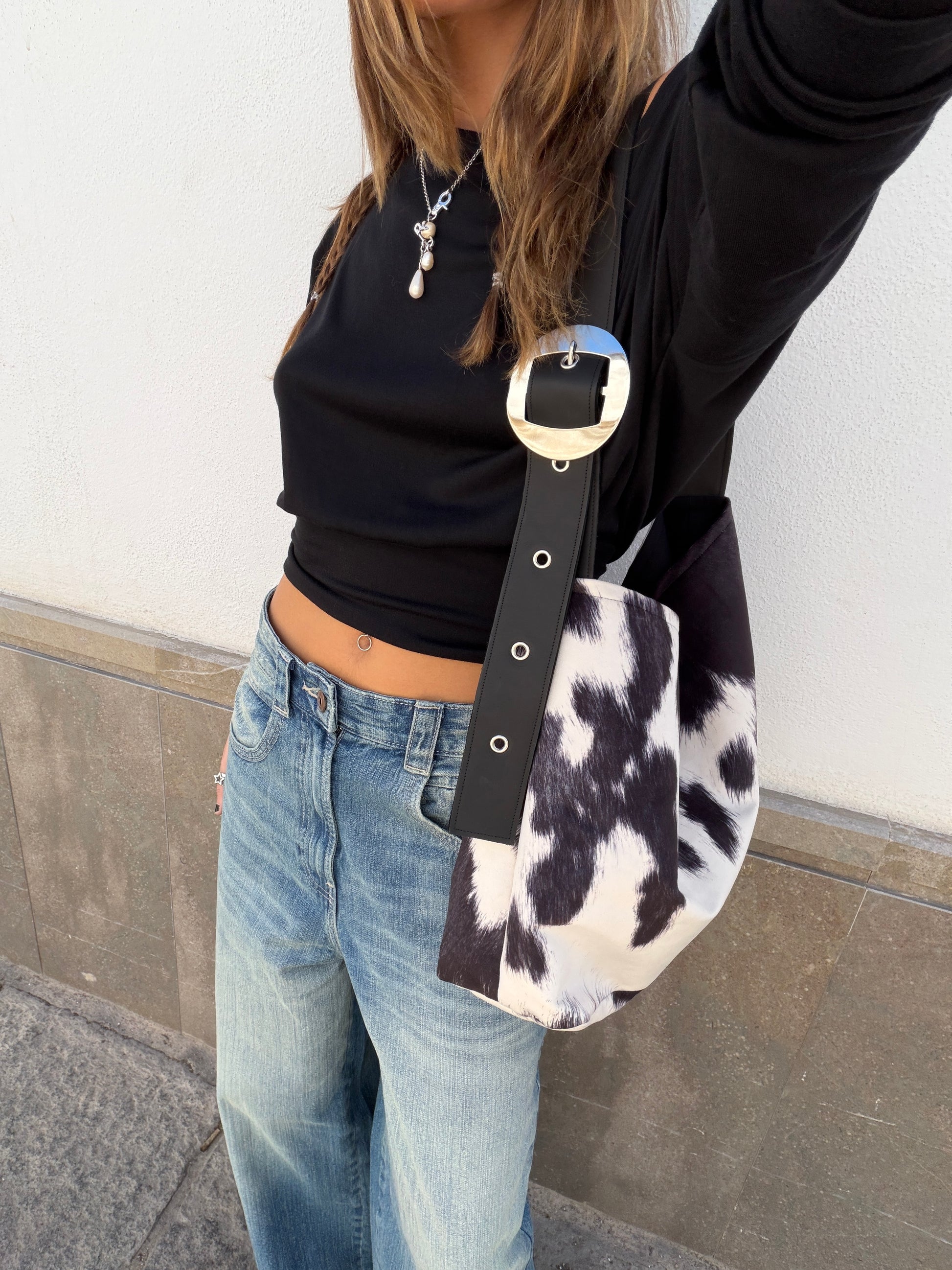 Animal print vaca gris, terciopelo corto sintético antimanchas y asa de piel de vacuno