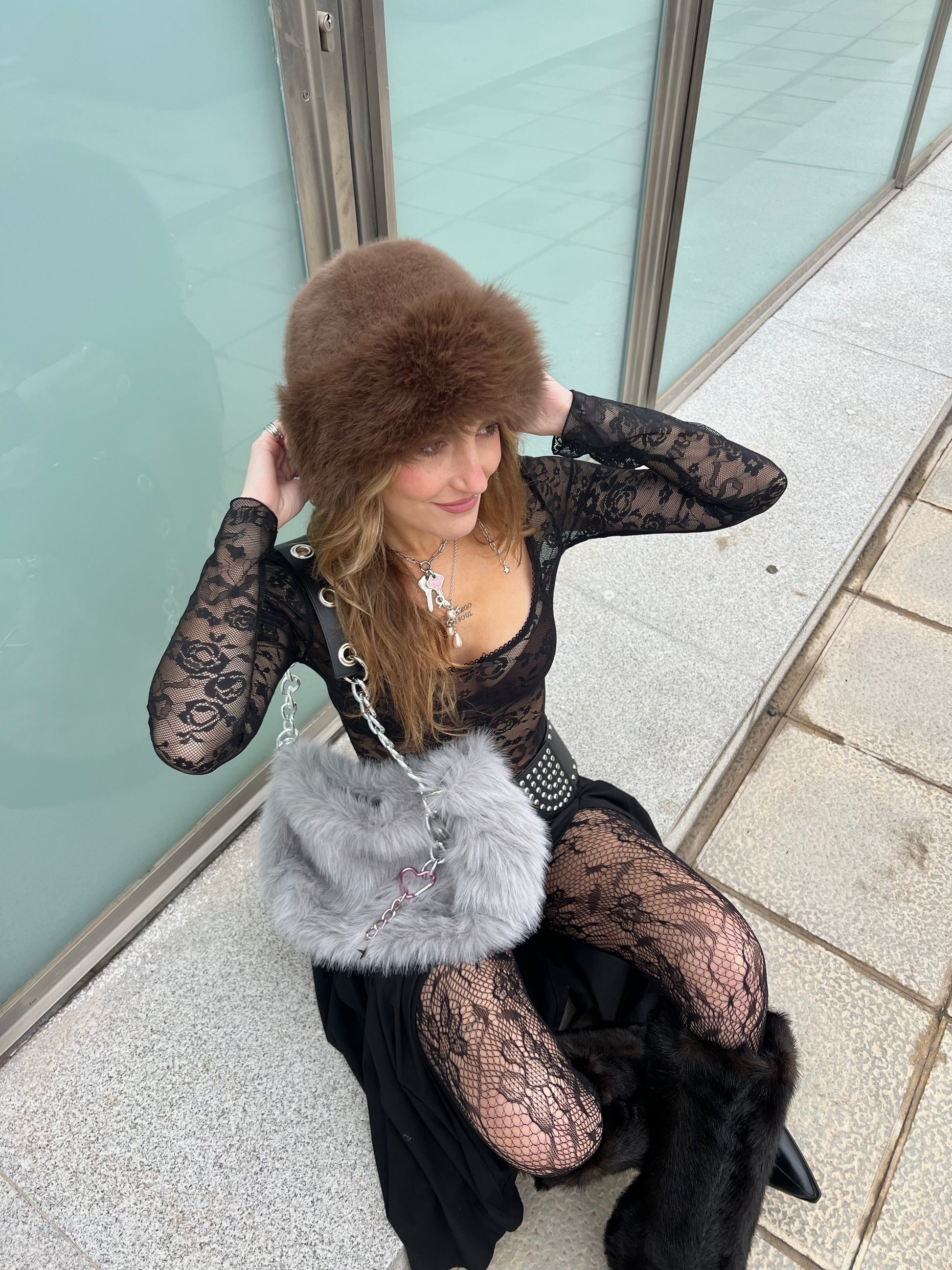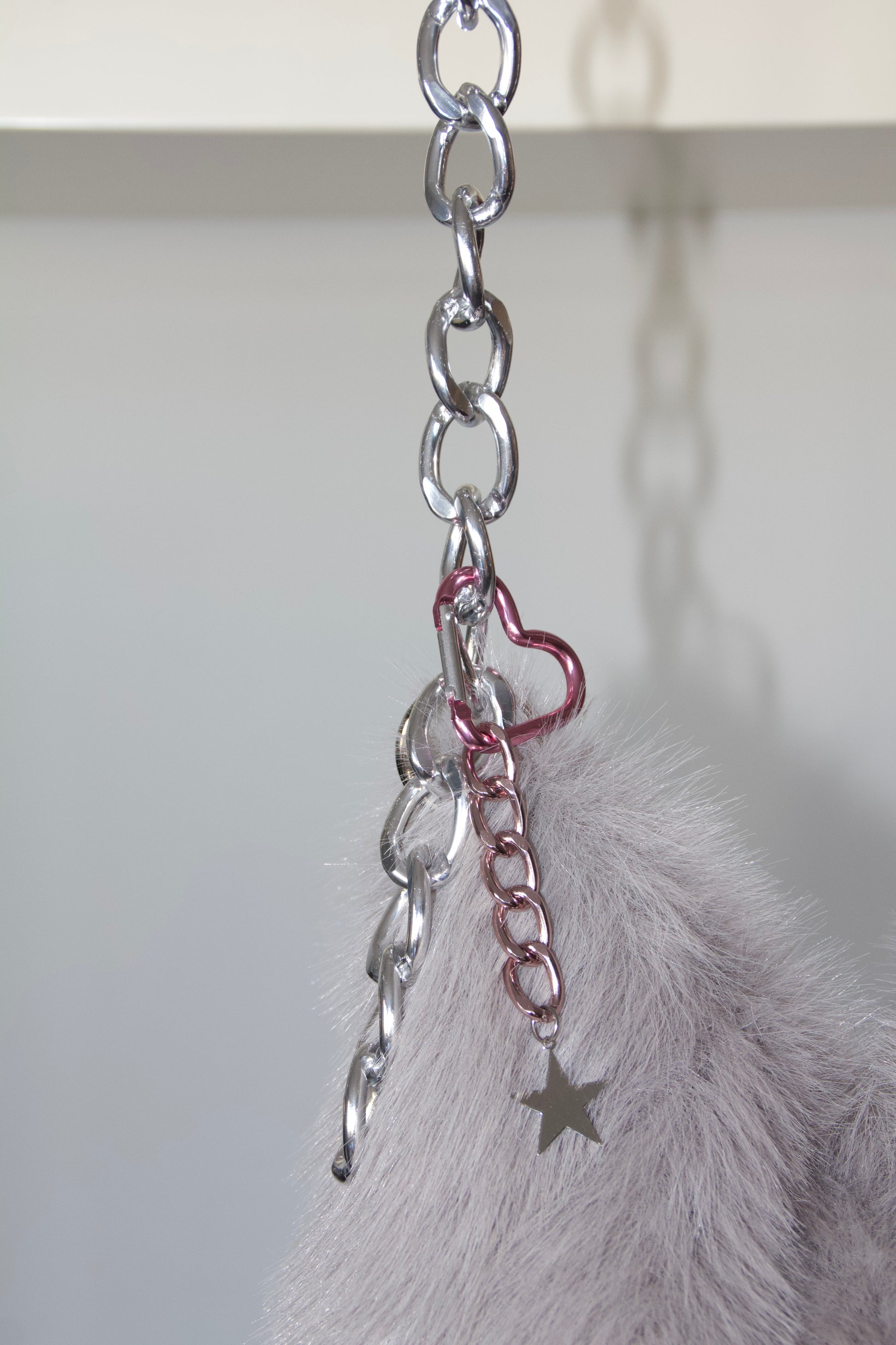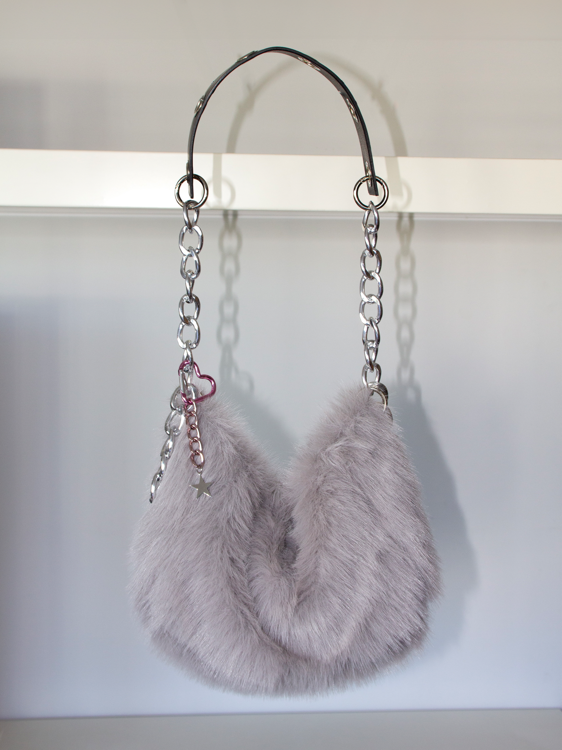 Grey fur bag with chains and metallic details