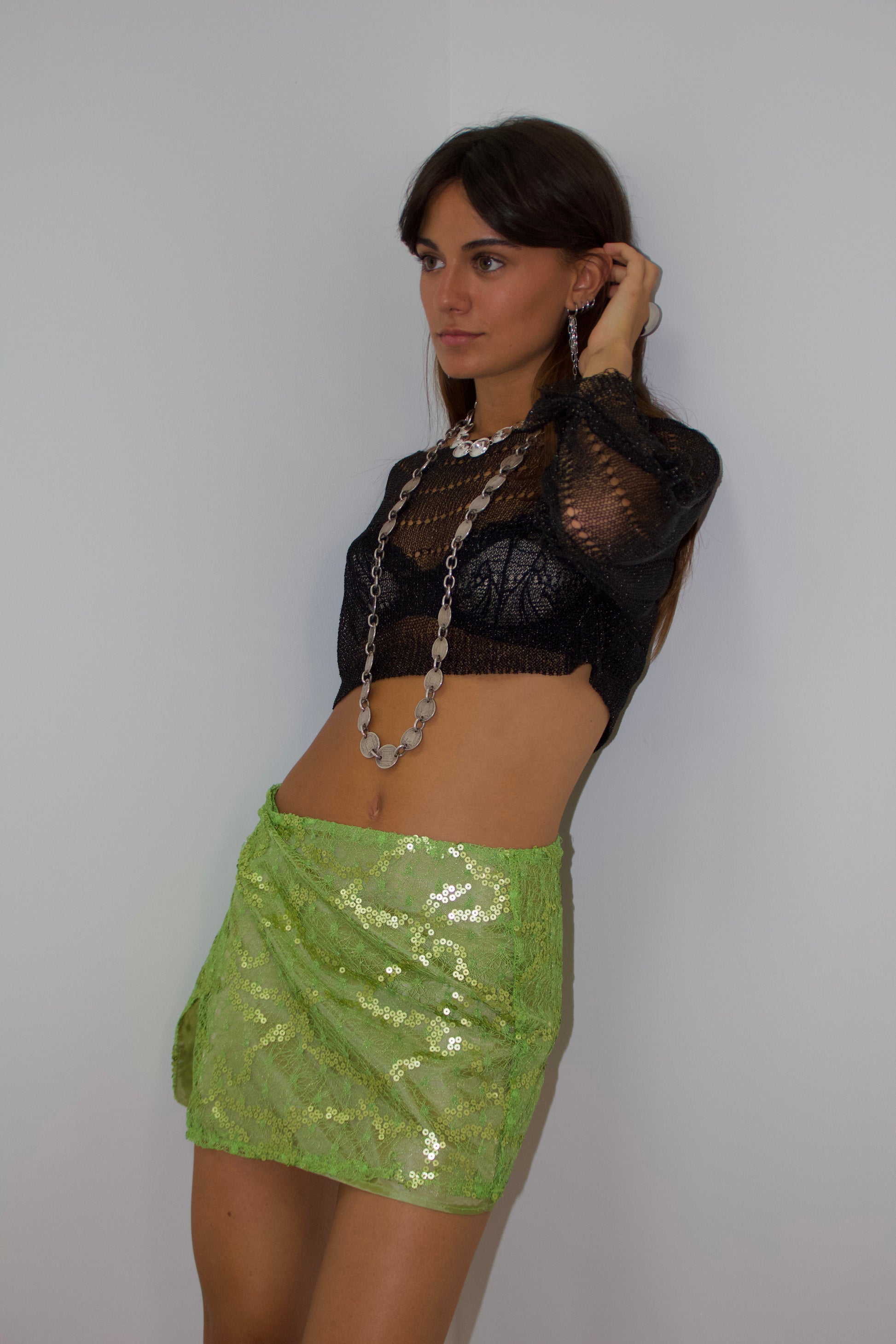 Guipur con lentejuelas bordadas verde, cierres de botón metálico para 3 tallas;